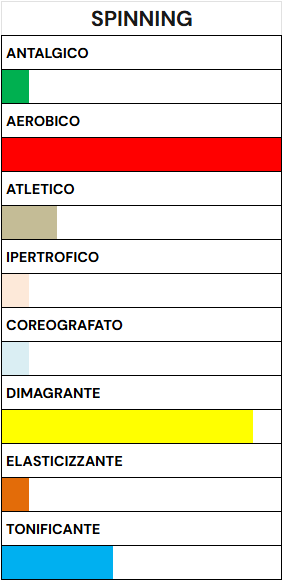 Lo spinning è un allenamento aerobico che si pratica su una bicicletta stazionaria (spin bike) e simula il ciclismo su strada. Le lezioni di gruppo e a ritmo di musica, alternano fasi di pedalata ad alta intensità, sprint e discese simulate a momenti di defaticamento. Offre molti benefici, tra cui miglioramento cardiovascolare, tonificazione muscolare e perdita di calorie, ed è ideale per chi vuole allenarsi al coperto in modo divertente e coinvolgente